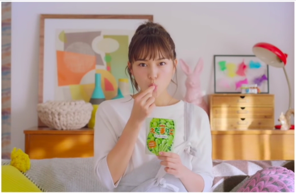 そのCMがYouTubeなどで公開されており、一人の女性が色んな衣装や場所でえだまりこを食べていますね。